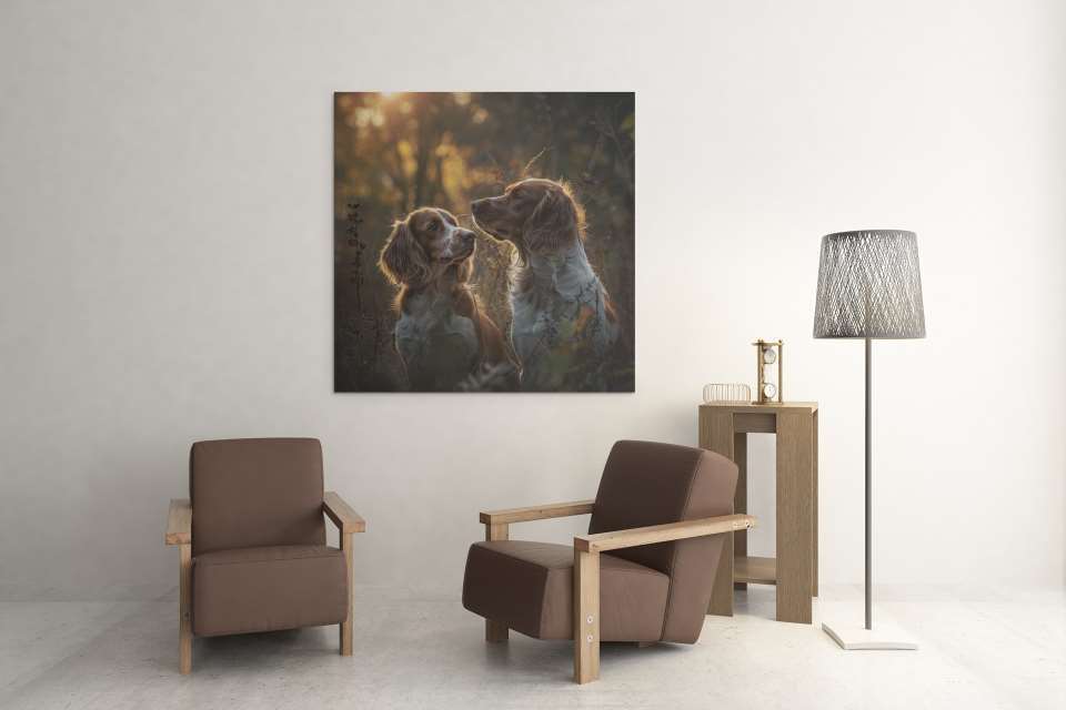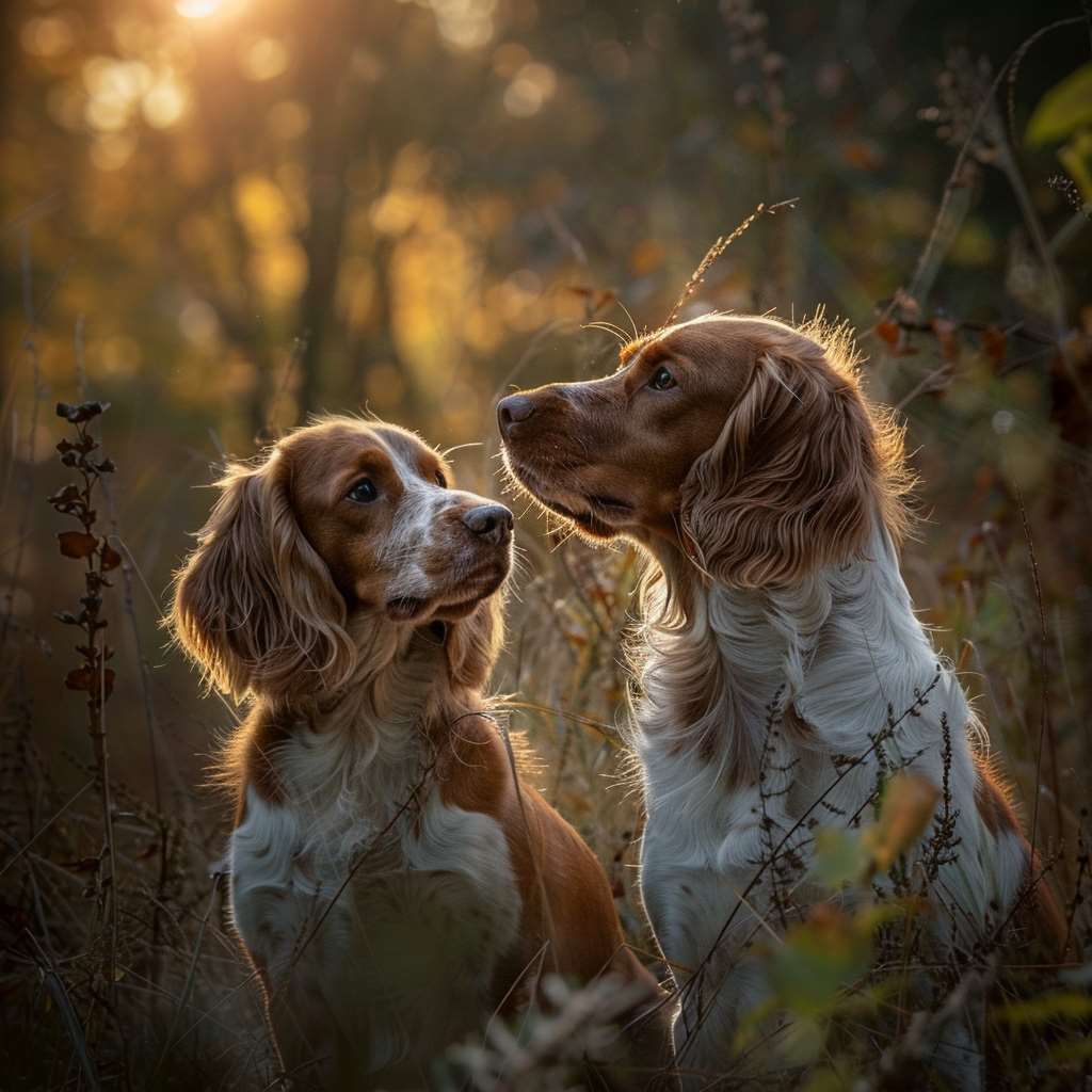 V nádherném podzimním světle stojí dva bretaňští ohaři. Jejich hřejivé, zlatavé srsti září v paprscích zapadajícího slunce, zatímco jejich oči prozrazují oddanost a přátelství. Tato plemeno je známo svou energičností, inteligencí a neuvěřitelně přátelskou povahou.
