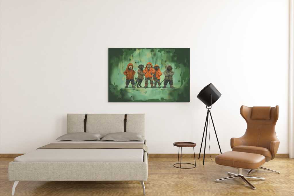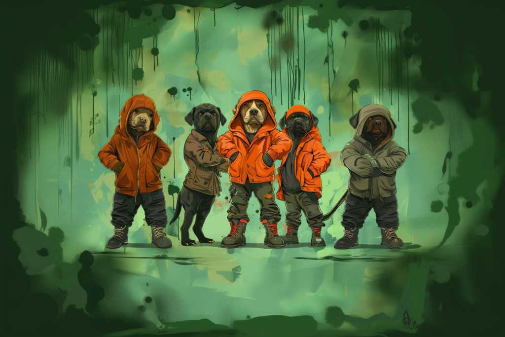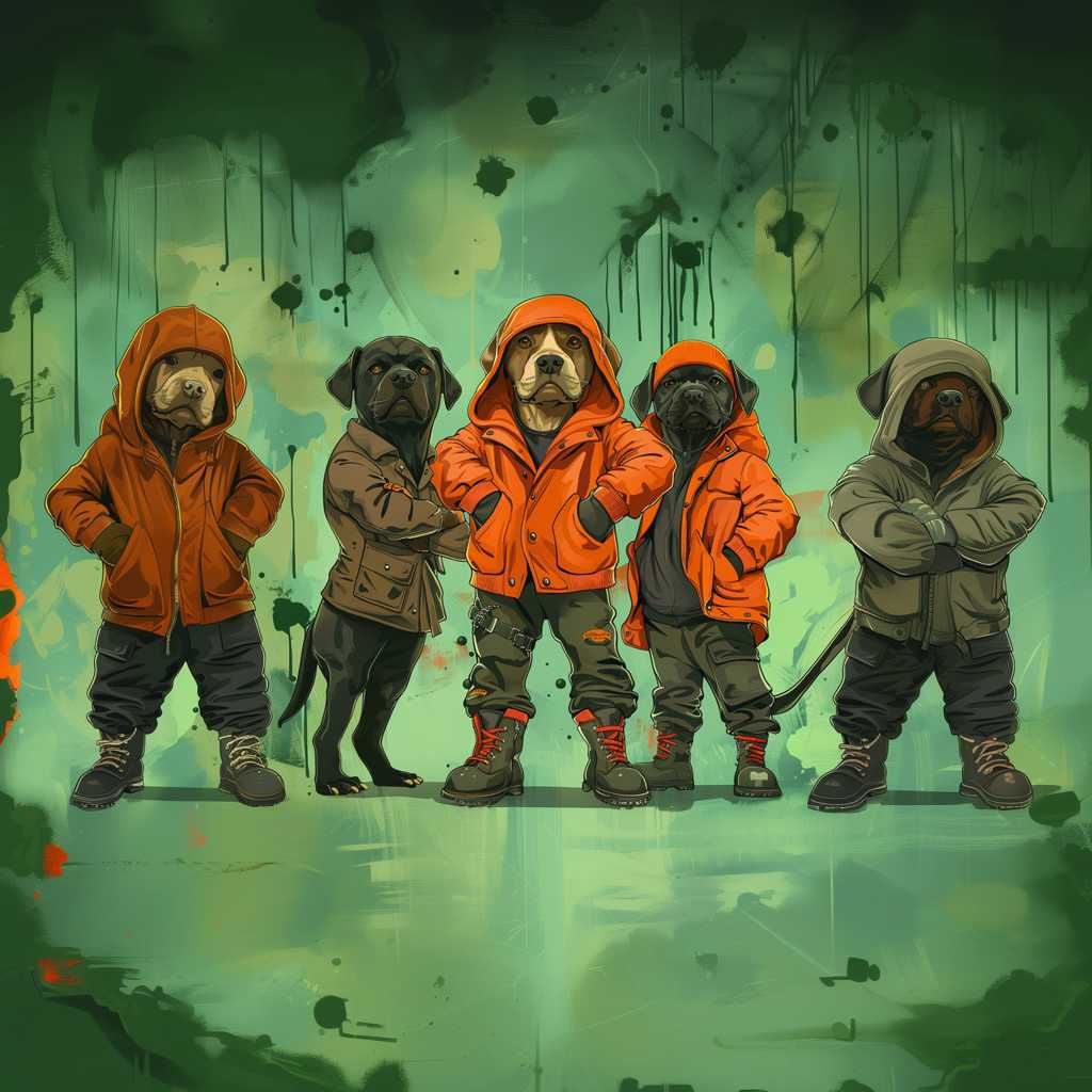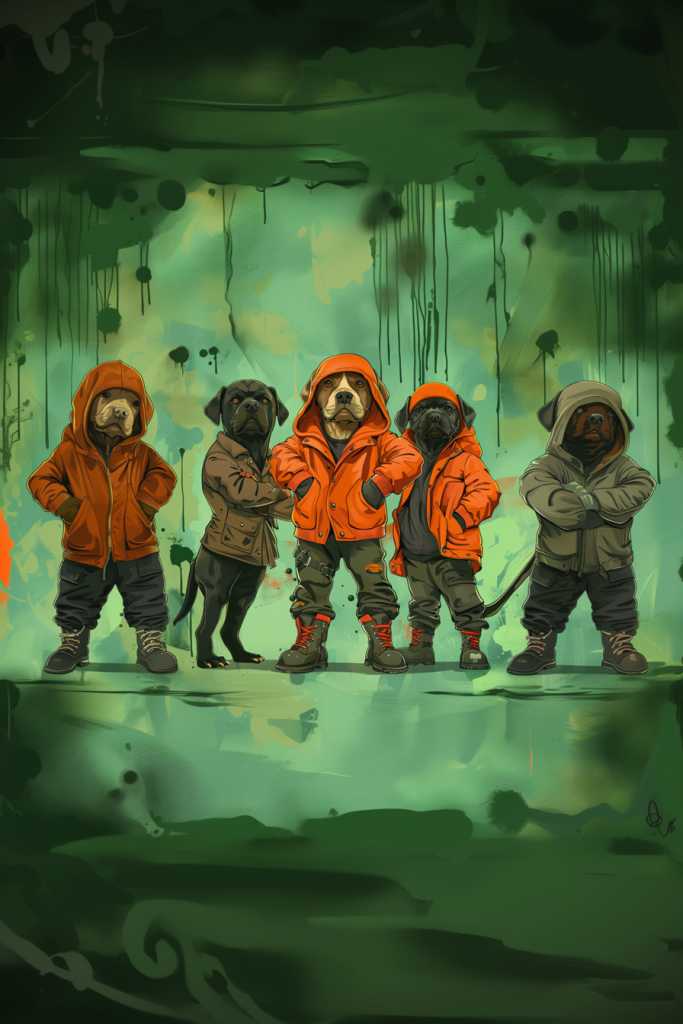 Obraz s názvem „Ve službě“ představuje scénu plnou odhodlaných a disciplinovaných psů, kteří jsou připraveni vykonávat svou práci s chladnou efektivitou. Tato podívaná zachycuje labradory různých barev oblečené do oranžových kombinéz.