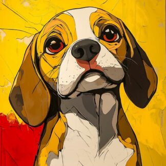 Když se zadíváte na tento živý obraz, okamžitě vás upoutá energický pohled bígla, který je plný zvědavosti a radosti ze života. Výrazný styl použitých barev, kde dominují živé tóny žluté, červené a modré, dodává obrazu neuvěřitelnou dynamiku a život. Žluté pozadí umocňuje vřelý a veselý dojem, který z obrazu vyzařuje, a činí z něj ideální doplněk jakéhokoli interiéru.